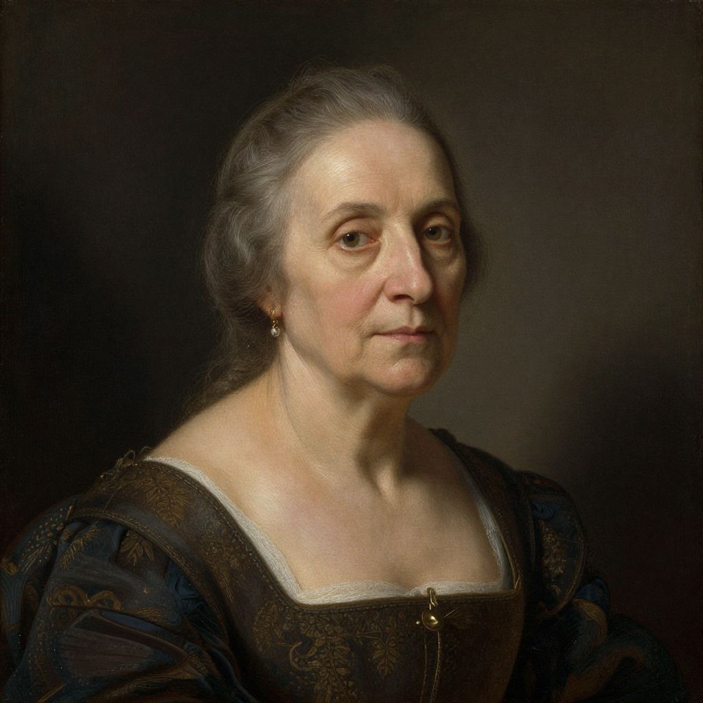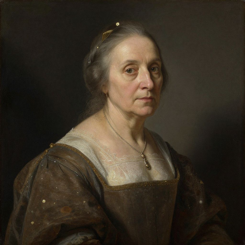 Photorealistic painting of an elderly white woman with gray hair, wearing a dark, patterned dress, and small gold earrings, against a dark background
