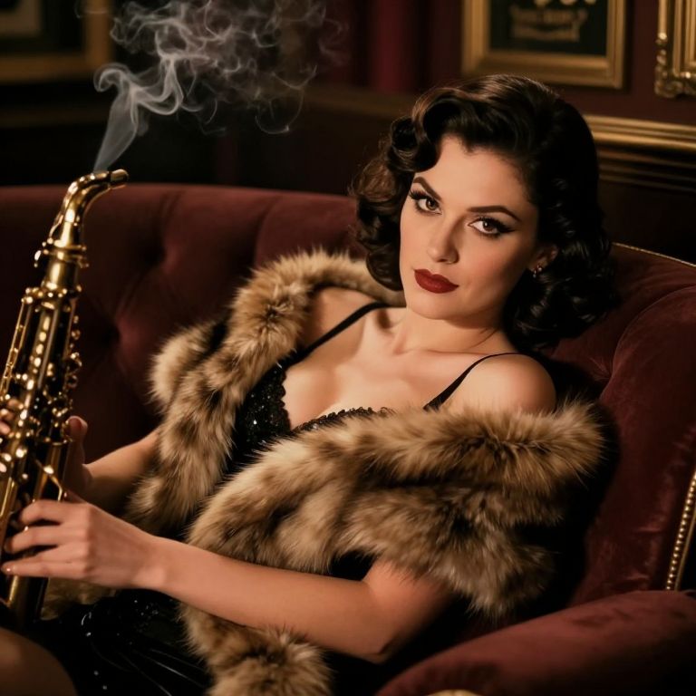 Photograph of a glamorous woman with fair skin and dark, wavy hair, sitting on a plush red velvet couch. She wears a black, sequined dress with a luxurious, brown fur stole draped over her shoulders. She holds a golden saxophone with a wisp of smoke curling from the mouthpiece. Her makeup is dramatic, with bold red lipstick and dark eye makeup. The background features dark wood paneling and framed pictures, adding to the vintage, sophisticated atmosphere. The lighting is warm, highlighting her elegant features and the texture of the fur stole.