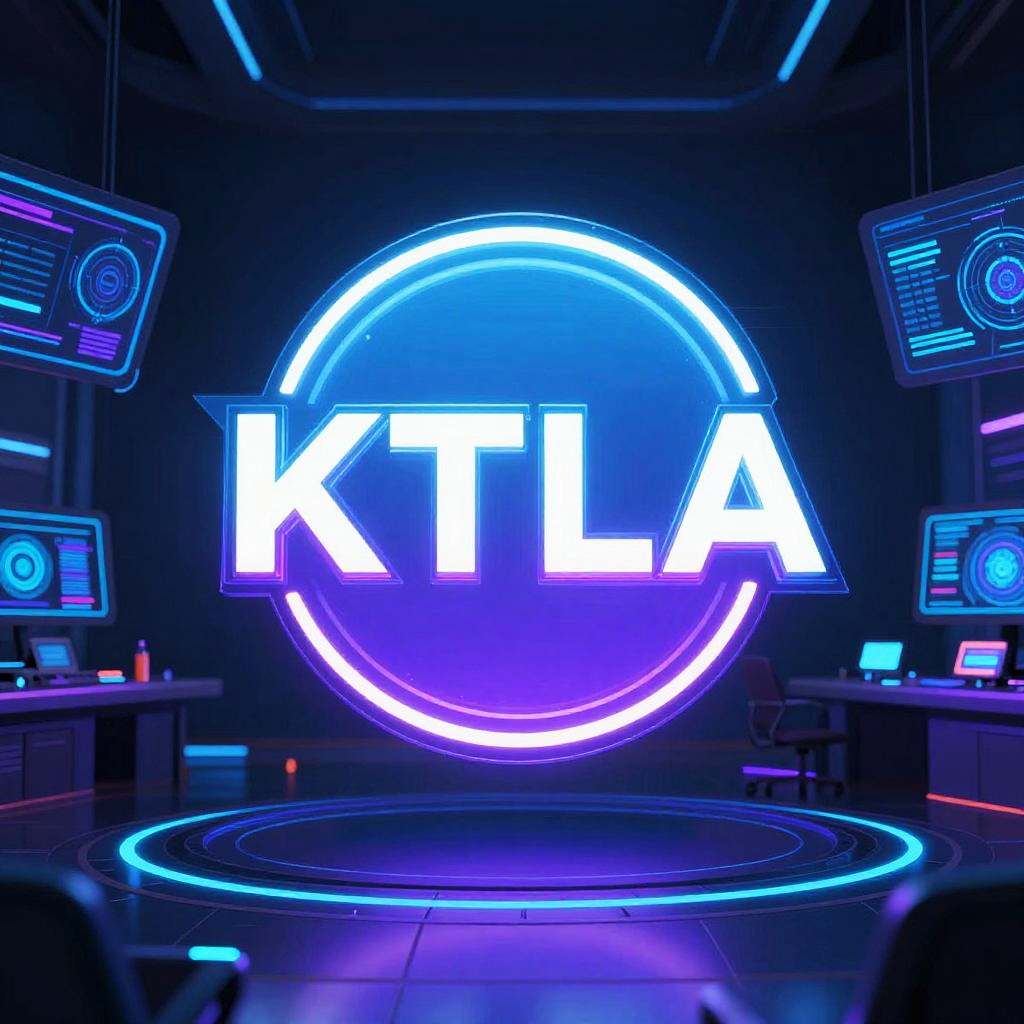 KTLA logo concept in a futuristic environment, sleek neon design glowing in a dark high-tech media control room, holographic interfaces and digital screens surrounding the logo, vibrant blues and purples, cyberpunk aesthetic with sharp detail