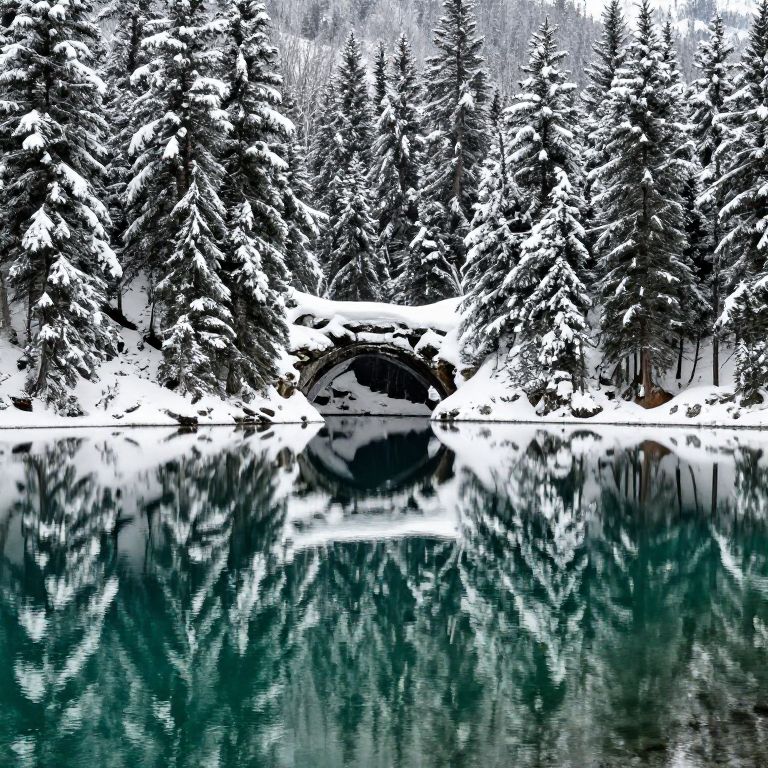 Serenity whispers through the still waters of Emerald Lake, where snow-kissed pines and the arching Natural Bridge mirror each other in perfect harmony, inviting contemplation of nature’s eternal embrace.