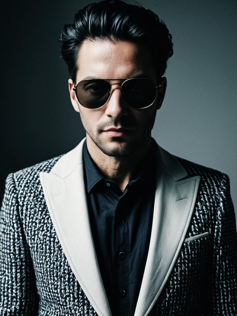 Man in Modern Fashion Costume, photorealistic fashion portrait, cinematic realism
