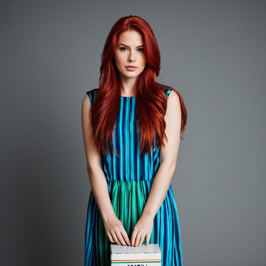 Portrait of a young woman with long red hair wearing a sleeveless blue and green striped dress resembling a crayon box. She stands against a plain grey background, looking directly at the camera with a neutral expression, holding a white box. The image has a realistic style with vibrant colors in her clothing.