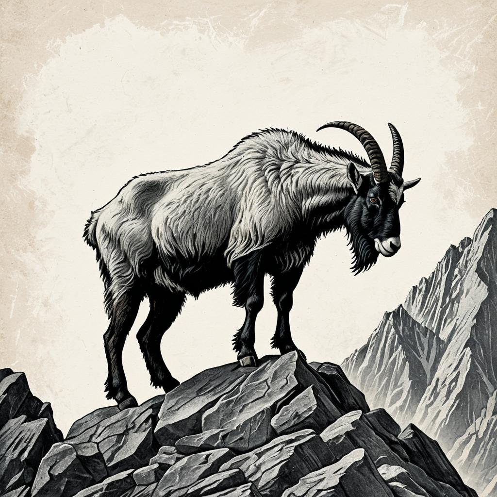 A stylized illustration of a rugged mountain goat standing on steep rocky cliffs. The goat features detailed fur and curved horns, depicted with an ashy chalk pastel texture. The background showcases towering jagged mountain peaks, emphasizing themes of courage and strength.