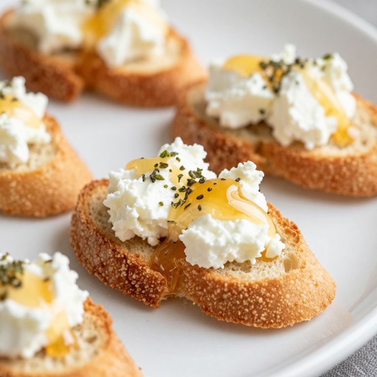 Close-up of a savory appetizer with crispy golden crostinis topped with creamy goat cheese, drizzled with honey and sprinkled with herbs, served on a white porcelain dish, under bright light highlighting the textures and intricate details of the food.