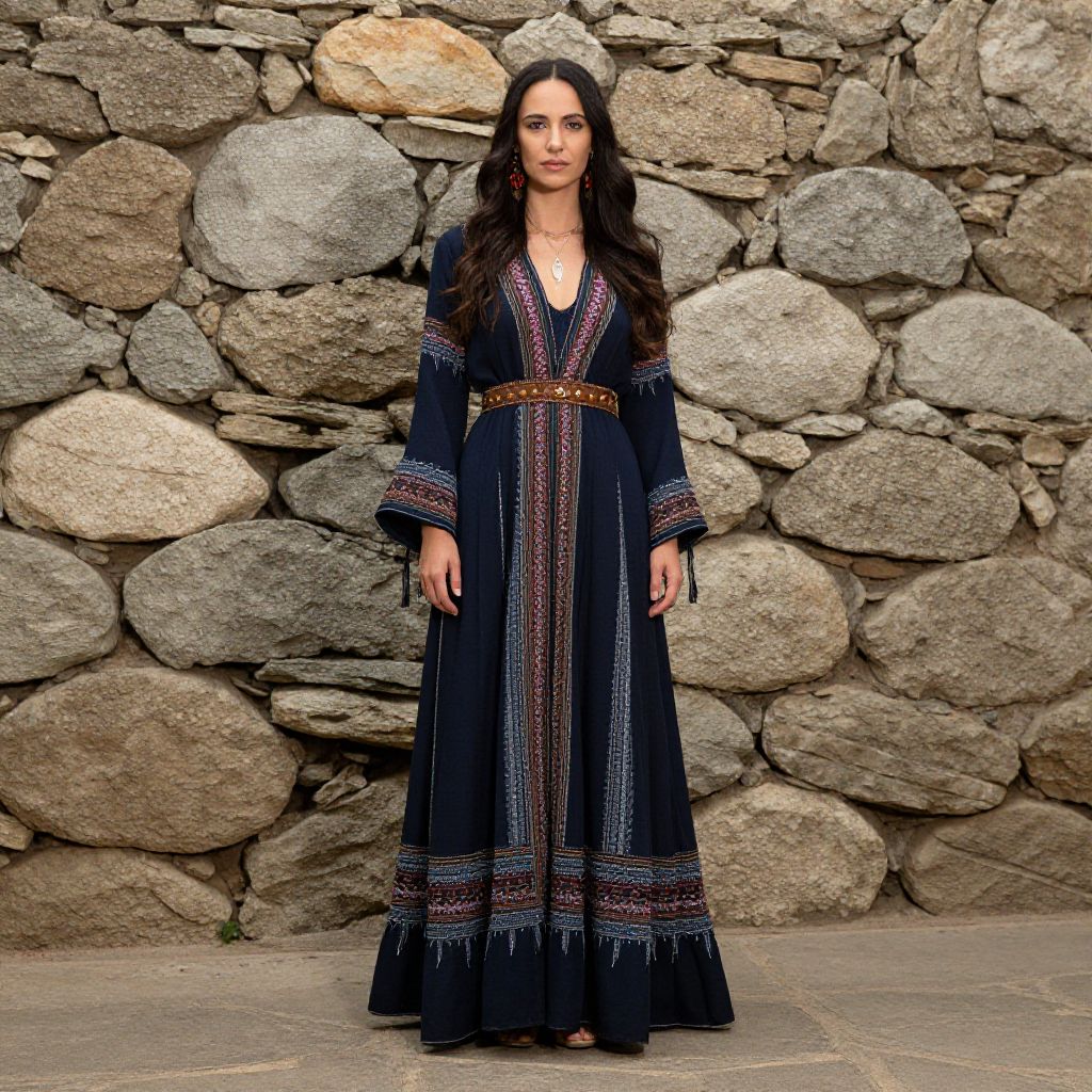 Photograph of a woman with long, wavy dark brown hair and fair skin standing against a rustic stone wall composed of large, irregularly shaped rocks. She wears a long, dark navy blue dress with intricate red and white embroidery along the front, sleeves, and hem. The dress is cinched at the waist with a brown belt. Her expression is neutral, and she stands with her arms relaxed by her sides. The stone wall in the background has a textured, rough appearance, contrasting with the smooth, embroidered fabric of her dress. The ground is made of concrete.