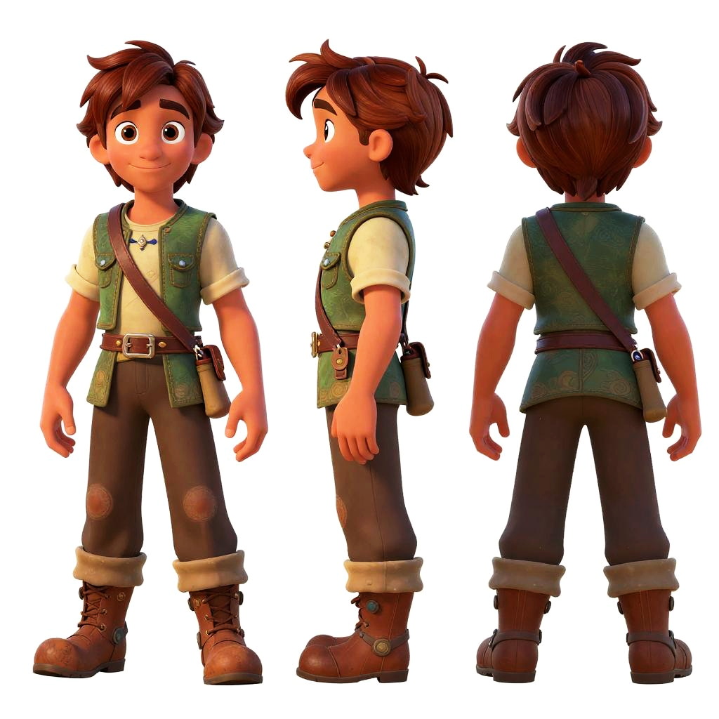 Disney character sheet of a heroic young adventurer with front, side, and back views, multiple outfits, intricate details, colorful and whimsical animation design