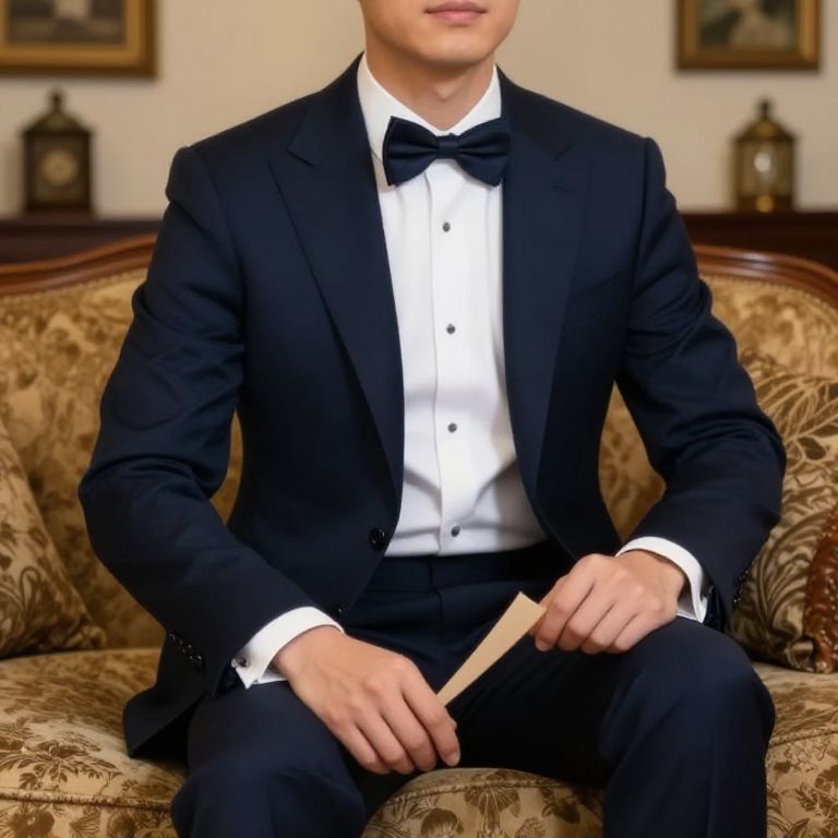 A classic navy suit with crisp white shirt and bow tie, seated on a vintage sofa in a cozy living room, warm indoor lighting, vintage decor, soft focus background, realistic texture, Flux style.
