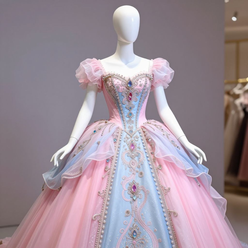 Photograph of a white mannequin wearing an elaborate, pastel pink and blue ball gown with intricate embroidery, sheer puff sleeves, and a full