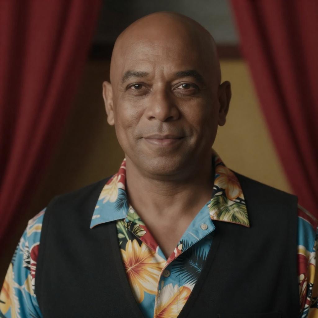 Middle-aged bald man with light skin, smiling widely, wearing a light-colored shirt with buttons, standing in a dimly lit kitchen. Background includes shelves with jars and a large pot. Warm, orange lighting. Man centered, chest-up. Kitchen setting with cooking utensils.