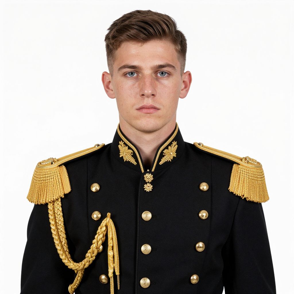 Photograph of a young white man with short brown hair and fair skin, standing against a plain white background. He's wearing a black military-style uniform with gold buttons, epaulettes, and trim, along with a black belt and a square buckle. His expression is neutral, and he's looking straight at the camera. The uniform has a formal, polished look.