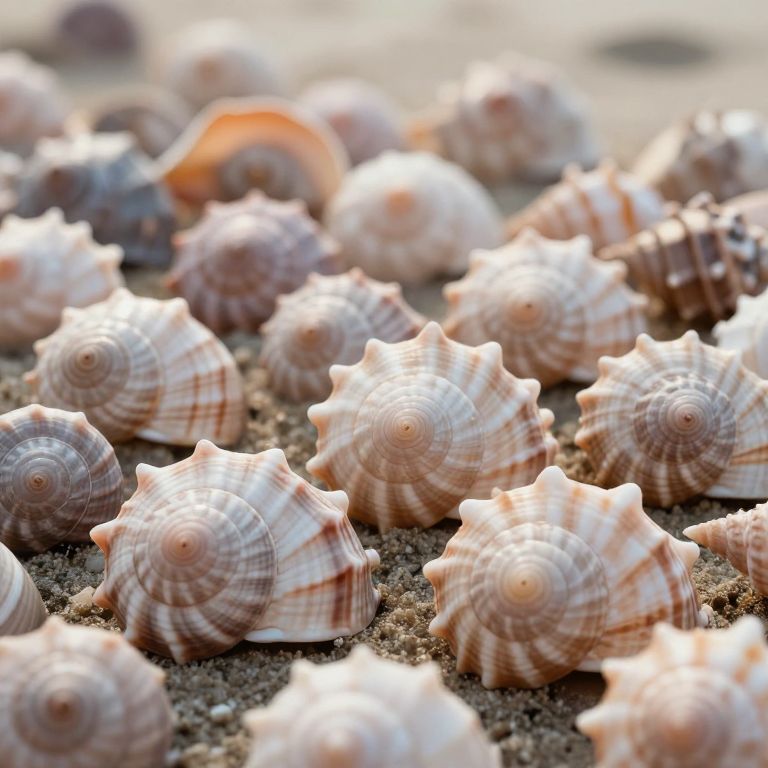 Photograph of numerous small, spiral-shaped seashells scattered on a sandy beach. The shells are predominantly white with brown and pink striped patterns, featuring prominent ridges and spikes. The sand is coarse and textured, with a mix of light and dark brown hues. The background is softly blurred, emphasizing the detailed textures of the shells in the foreground. Sunlight highlights the shells' natural colors and patterns, creating a warm, beachy atmosphere.
