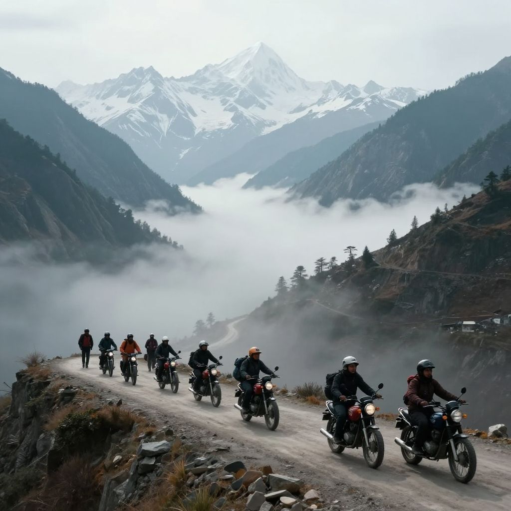 Transport yourself to the breath-taking heights of Remote Mountain Passes in India. Envision standing at the precipice of Rohtang Pass in Himachal Pradesh, surrounded by majestic Himalayan peaks. Here, adventurers and trekkers from around the world gather for thrilling journeys through these high-altitude transit routes. Picture a group of bikers revving their engines, ready to conquer the challenging terrain, while others embark on spiritual pilgrimages, seeking solace in the serene mountains. These passes offer more than just physical challenges; they provide opportunities to connect with the awe-inspiring nature and rich cultural traditions of the Himalayas. Capture the essence of these remote mountain passes, where the air is crisp, the views are awe-inspiring, and the spirit of adventure is palpable, Remote Mountain Passes, Adventure, Trekking, Spiritual Pilgrimage, Himalayan Landscapes, Cultural Exploration, foggy, haze, cinematic, (masterpiece, best quality, ultra_detailed, highres, absurdres:1.2, realistic)