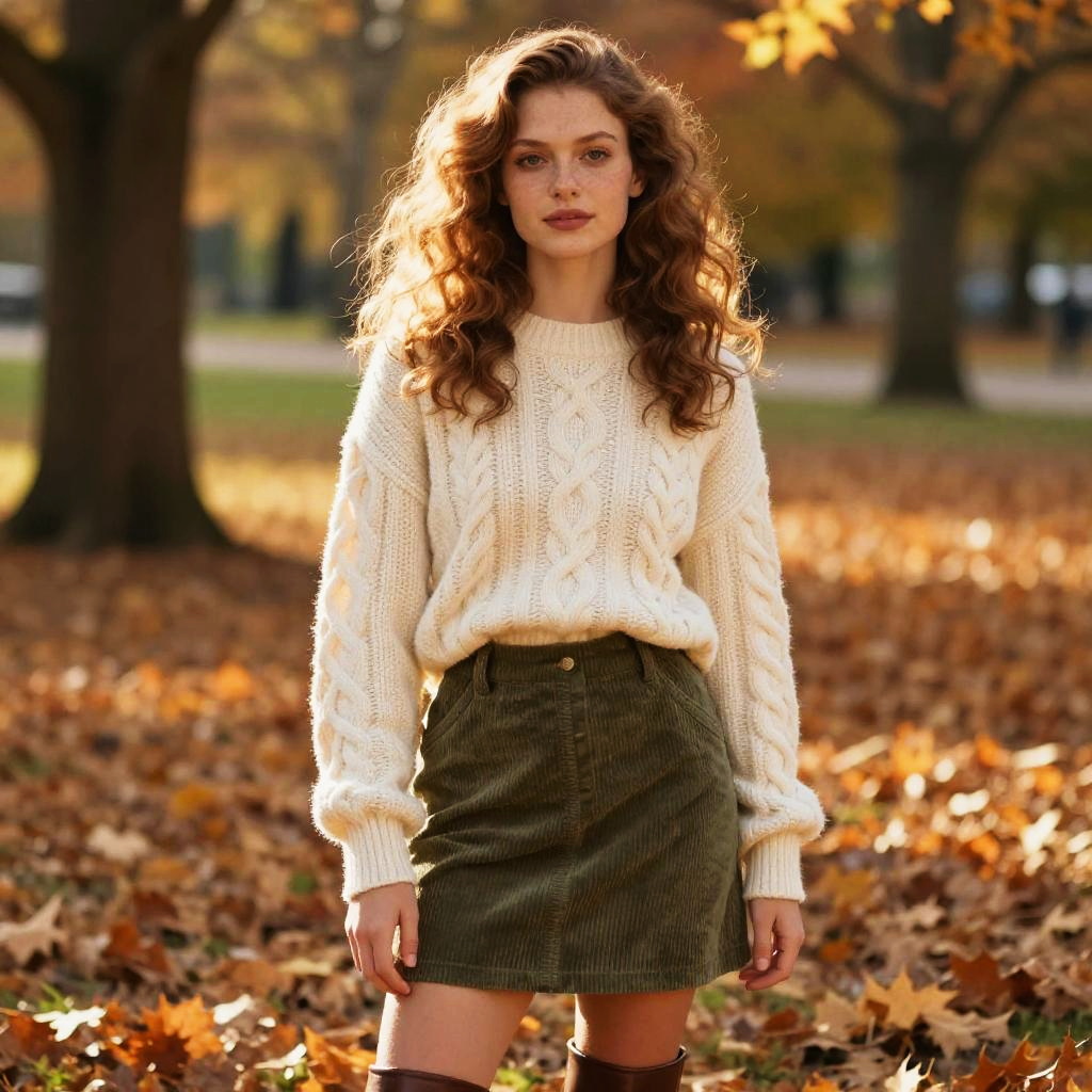 Cinematic fashion portrait of young white woman with freckles and loose chestnut curls, set in sunlit autumn park with fallen orange leaves and soft warm light, wearing cream cable-knit sweater paired with olive green corduroy skirt and brown leather ankle boots. Soft rim lighting, balanced natural color, shallow depth of field, subtle film grain, high detail, photorealistic editorial vibe; relaxed three-quarter pose, wind-tousled hair, confident gaze.