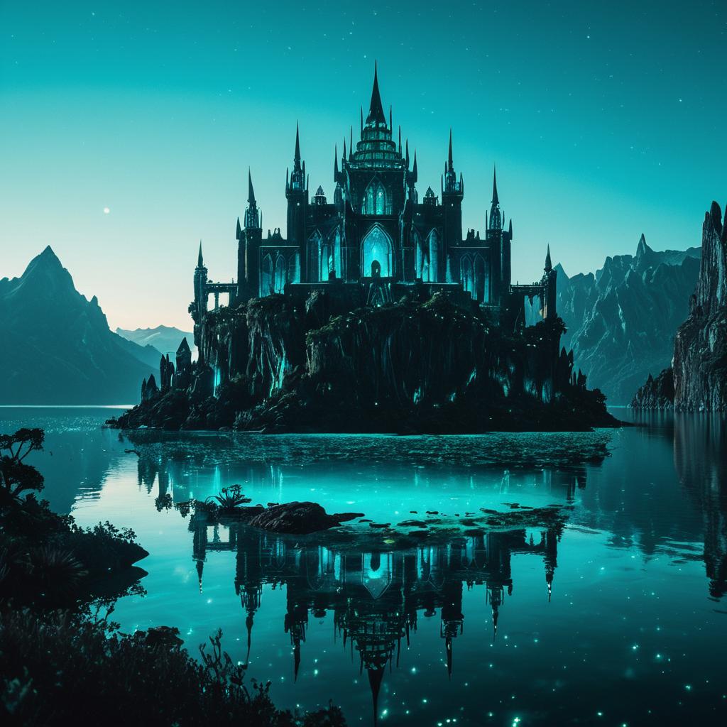 An elven citadel glowing with magical energy on floating islands above a crystal-clear sea with ancient spires and luminous vines perched on a high mountain edge above a black lake at dusk. Captured in iridescent turquoise tone with cinematic lighting in 4K, the scene has an ultra-realistic feel with a wide-angle perspective.