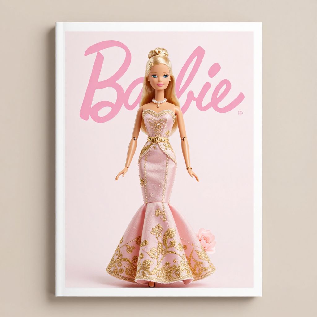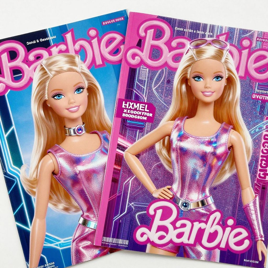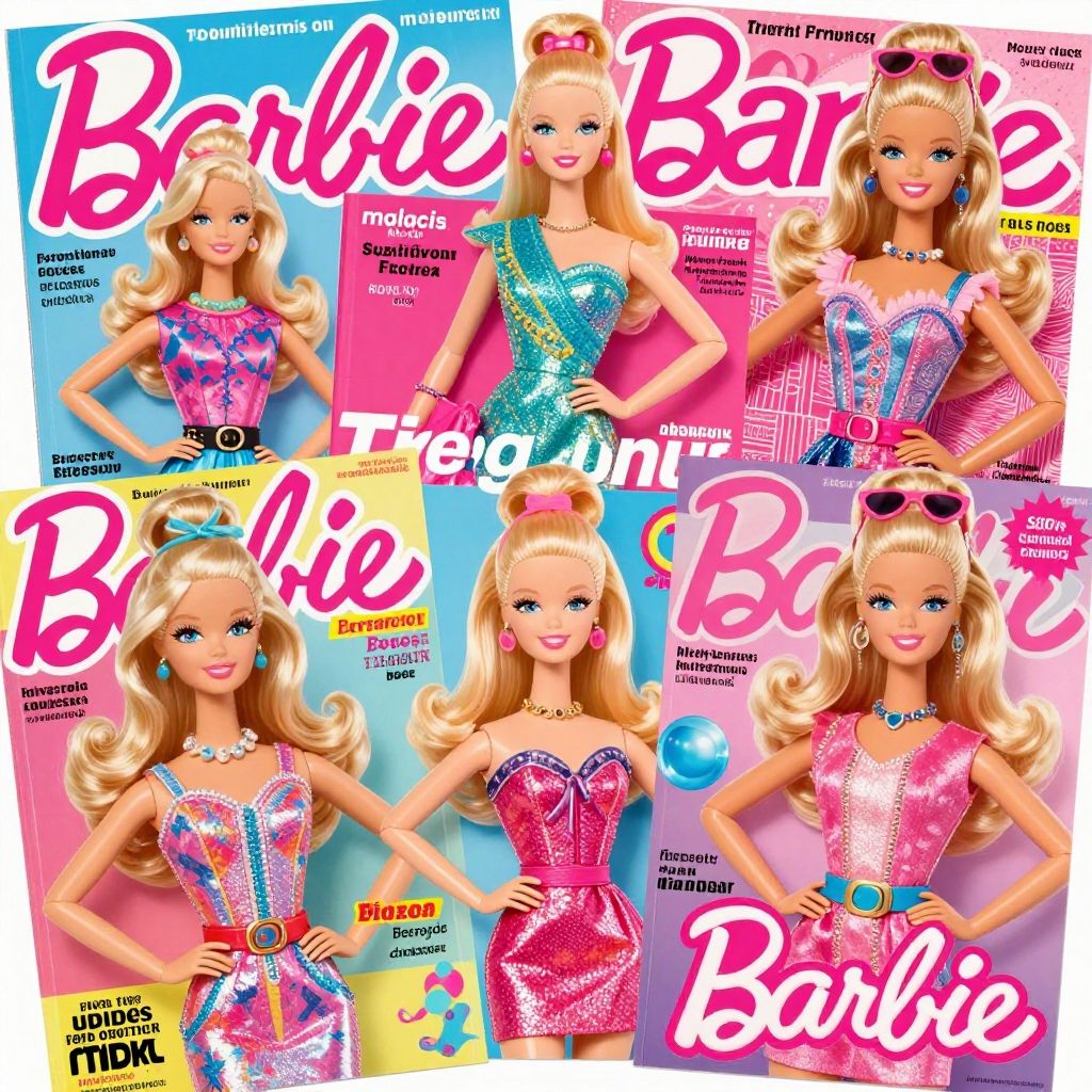 Barbie magazine covers featuring vibrant 1980s retro styles, glamorous fashion, neon colors, and playful typography, high detail, glossy finish, artful layouts
