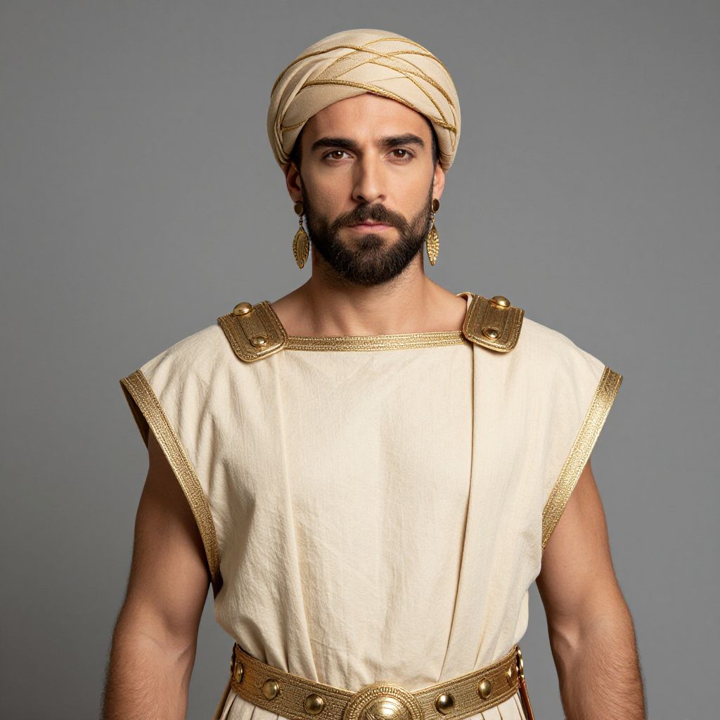 Photograph of a muscular, bearded man with medium brown skin and dark eyes, wearing a cream-colored, sleeveless tunic with gold-trimmed shoulder pads and a gold belt. He has a white turban wrapped around his head and large, gold, teardrop-shaped earrings. The background is a plain, solid gray. The man's expression is serious, and he stands facing the camera directly. The lighting is even, highlighting the textures of his clothing and his facial features.