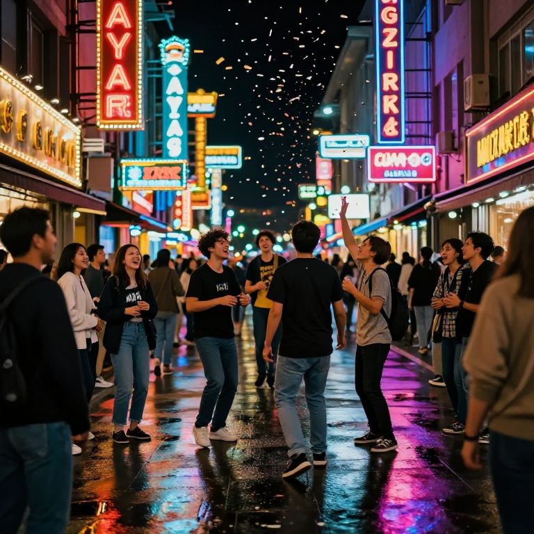 Exuberant urban street scene at night with glowing neon signs, crowds of people laughing and talking, street performers in mid-action, confetti falling from above, reflections sparkling on wet pavement, a vivid atmosphere of celebration and youthful energy.