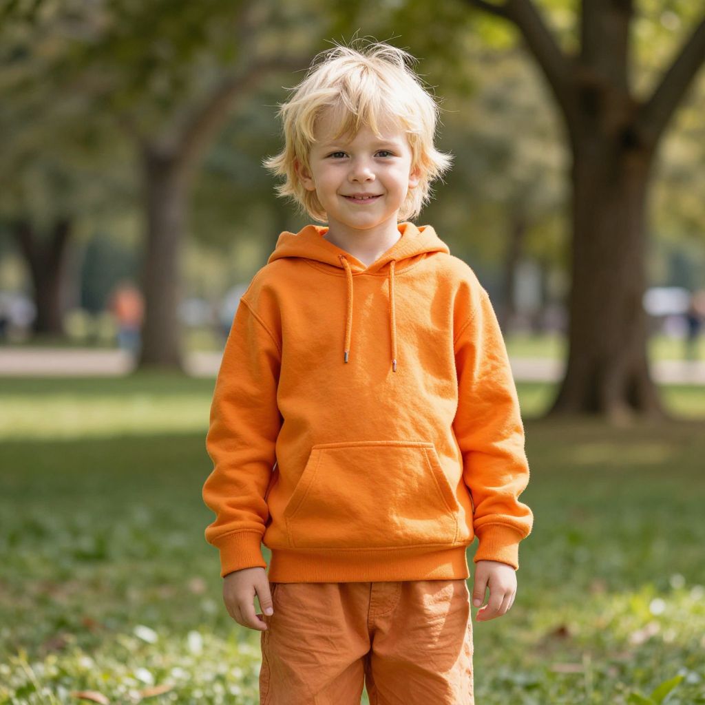 A young boy with bright blonde hair, messy and slightly tousled, wearing a vibrant orange hoodie with a hood pulled up slightly, paired with relaxed, casual orange pants that have a loose, comfortable fit. He stands in a sunny park setting, surrounded by green trees, dappled sunlight filtering through the leaves, and a soft breeze rustling the grass. He looks directly at the camera with a friendly, cheerful expression, his eyes sparkling with joy and curiosity. The soft sunlight casts gentle, warm shadows across his face and the environment, enhancing the natural, lively atmosphere. The overall mood is bright, wholesome, and inviting, capturing a moment of pure childhood innocence and outdoor joy.