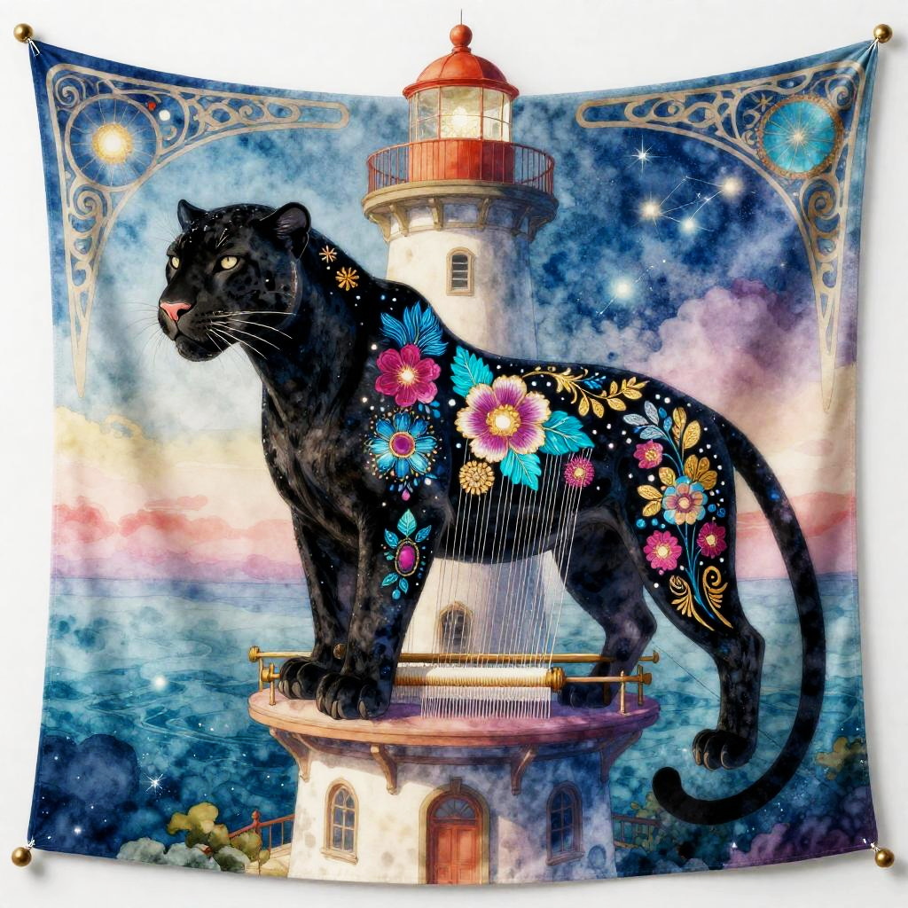 A dreamweaver loom-master stitching constellations into silk tapestries in a lighthouse-library tower perched above a bioluminescent bay, inspired by Art Nouveau. Featuring a majestic black panther adorned with vibrant electric cyan, magenta, and gold floral motifs, entwined with threads of light. The artwork showcases exceptionally high resolution and clarity, immersed in a dazzling watercolor style with bright, iridescent hues in 32k detail.