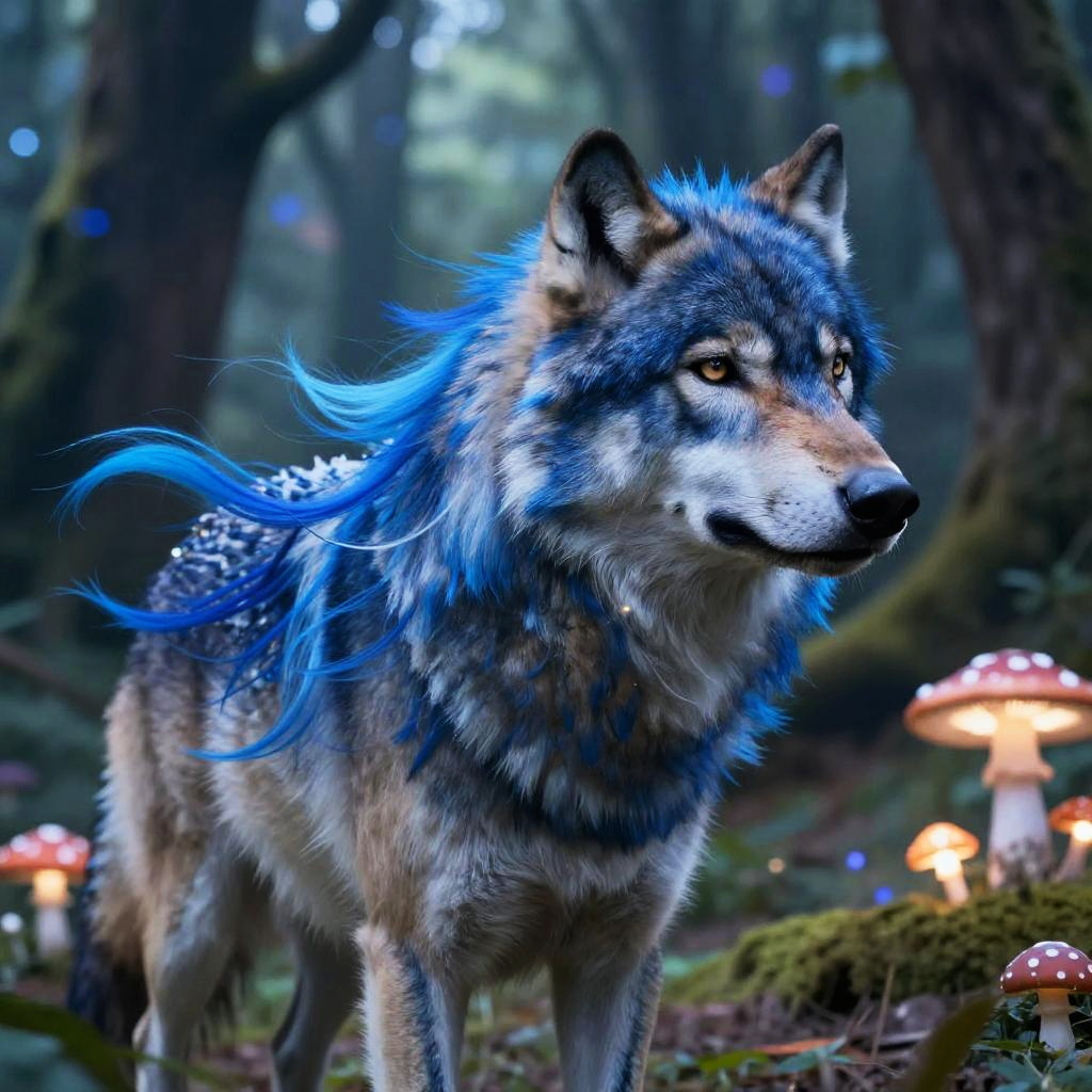 A vibrant digital painting depicts a majestic wolf with striking blue fur accents and a wild mane, standing in a mystical forest. The wolf's fur is a mix of gray, brown, and white, with glowing yellow eyes. Blue fur highlights its shoulders and back, and small white speckles are visible on its sides. The background is a softly focused forest, featuring glowing red and white mushrooms on the forest floor. The light filtering through the trees creates a magical, ethereal atmosphere. The wolf's intense gaze and confident stance convey a sense of power and mystique.