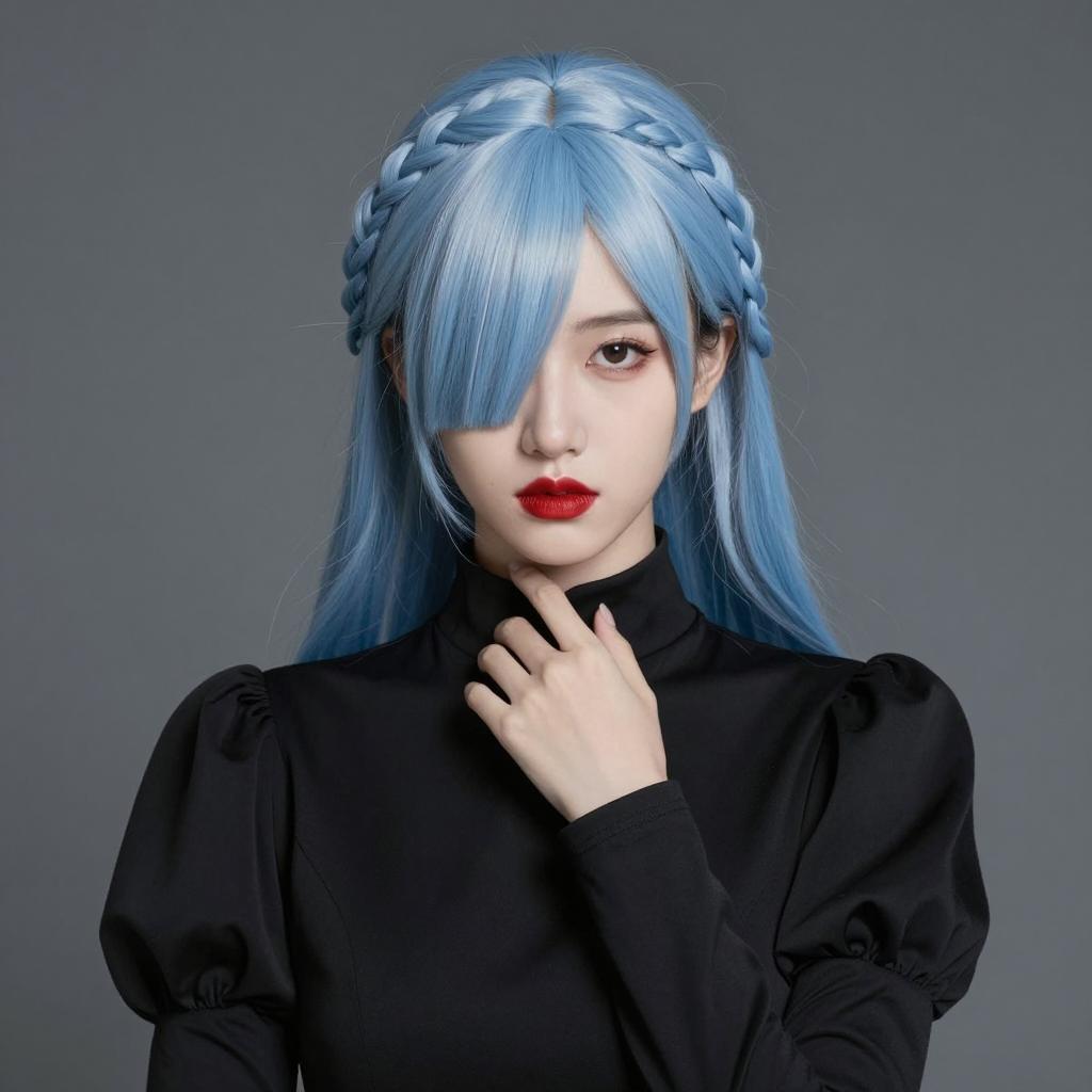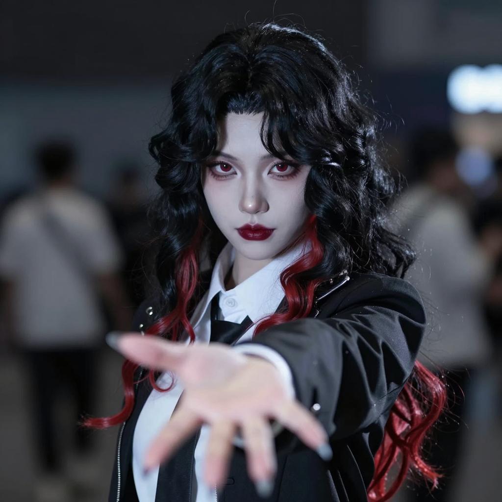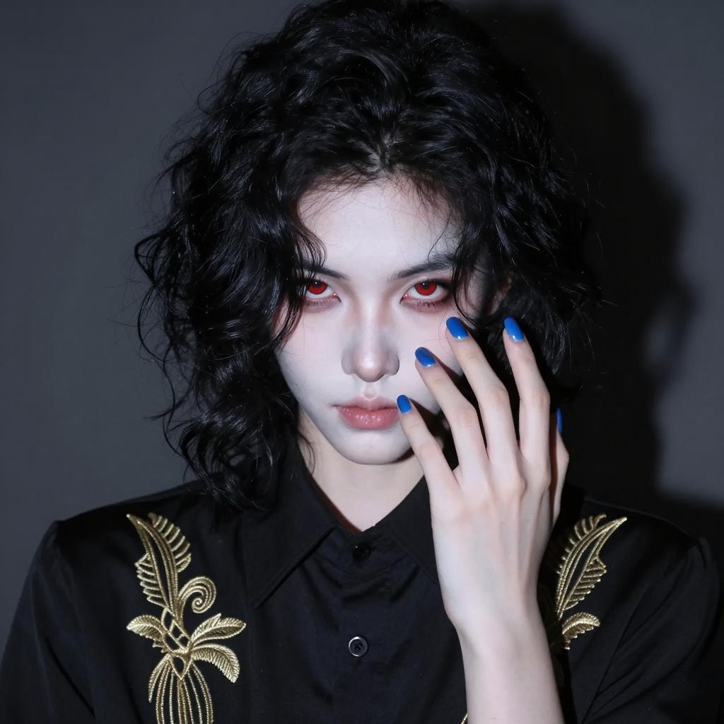 Close-up portrait of an androgynous person with pale skin, black wavy hair, and striking red eyes. They wear a black shirt featuring gold embroidery and have blue nail polish on their raised right hand. The background is dark, emphasizing the intense gaze of the subject.