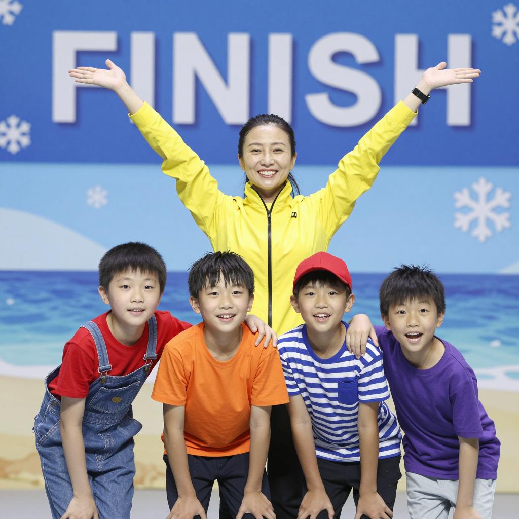 Five people on a stage. Background has a blue banner with "FINISH" and snowflakes. Central woman in yellow jacket, arms raised, smiling. Four children in front, leaning forward, smiling. Left child in red shirt and blue overalls, middle child in orange shirt, right child in striped shirt and red cap, far right child in purple shirt. Ocean and horizon in background. Children's arms around central woman. Bright colors, cheerful expressions.