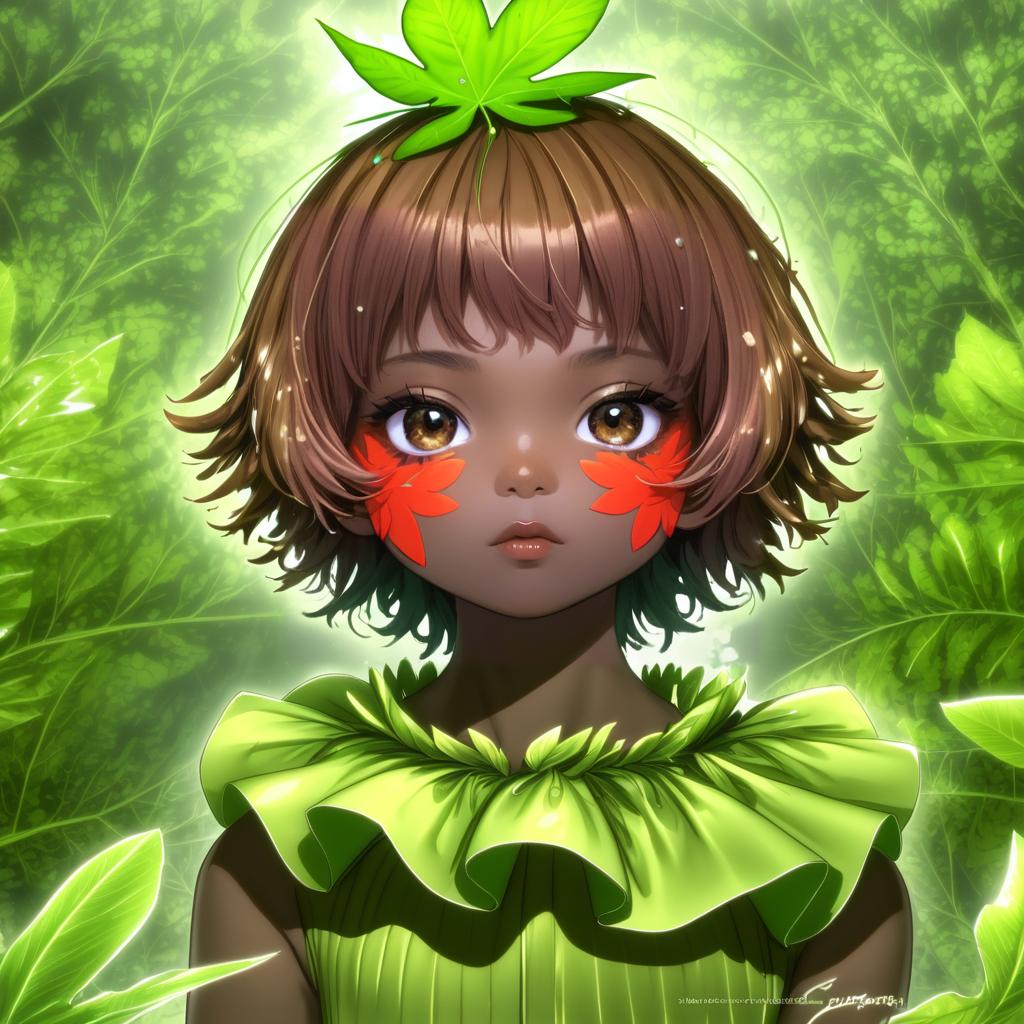Close-up digital artwork of a dark-skinned anime girl with short brown hair and large brown eyes. She has vibrant orange leaf patterns on her cheeks and a green leaf on her head. The girl wears a bright green leaf-themed ruffled top, set against a lush green leafy background, blending fantasy and nature aesthetics.