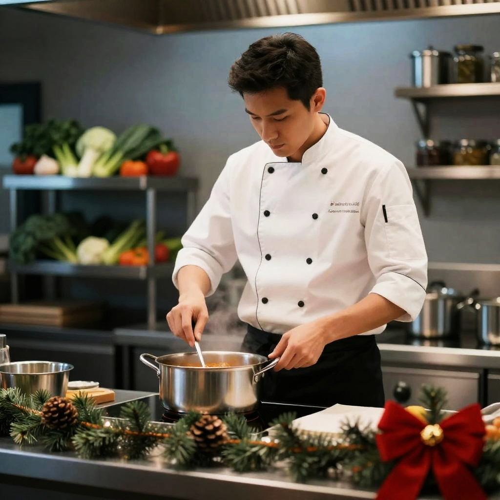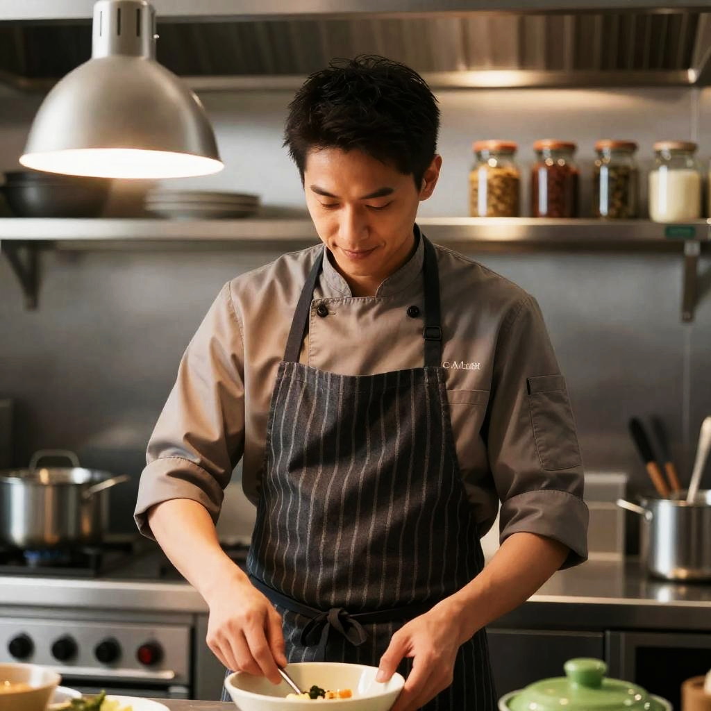 Photograph of a male chef with short dark hair, wearing a brown double-breasted chef jacket and striped apron. He stands in a modern kitchen, hands on a bowl, smiling slightly. Overhead lamp shines on him. Stainless steel appliances and shelves with jars in background. Chef's right hand rests on a green lid.