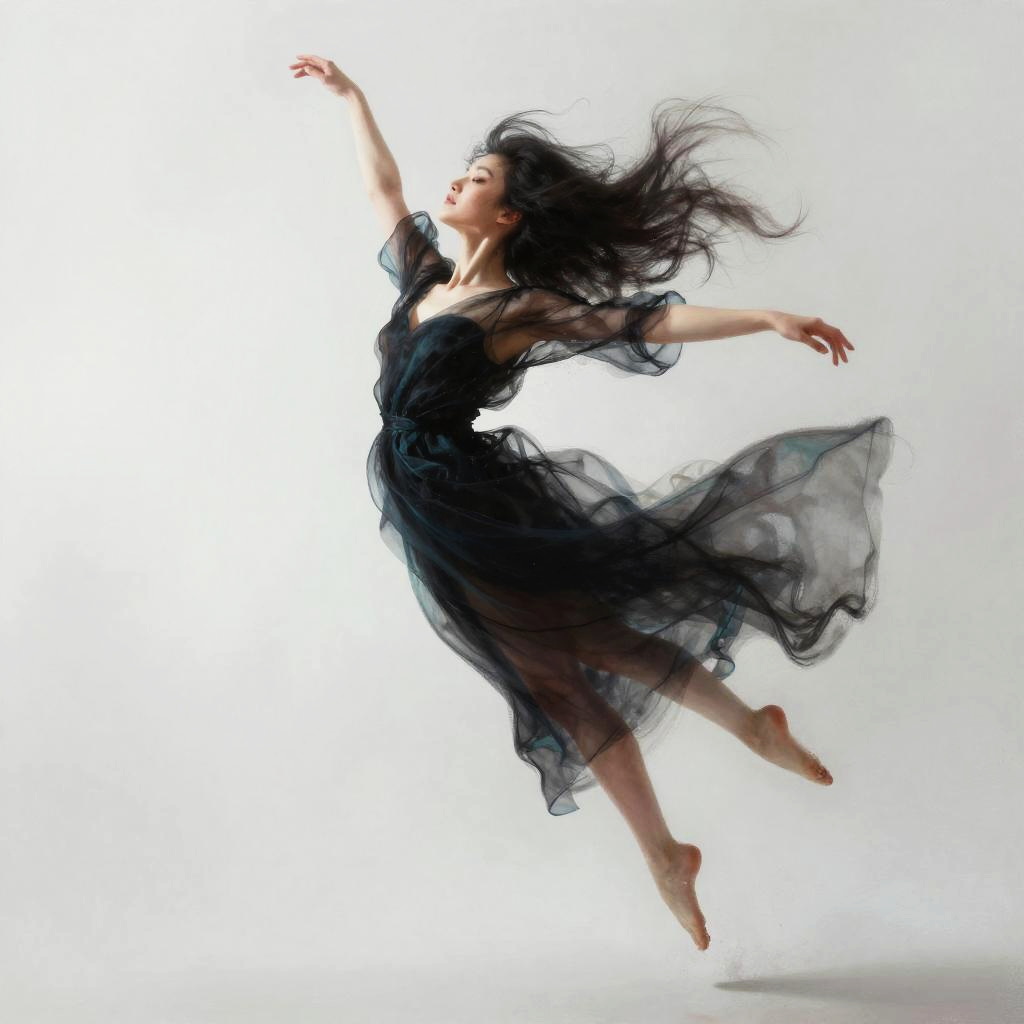 This digital painting features a dynamic, ethereal woman with flowing black hair and a translucent, black-and-teal dress that swirls around her. She's mid-leap, arms outstretched, creating a sense of motion and grace. The background is a soft, gradient white-to-gray, making her the focal point. The image has a dreamy, almost surreal quality, with fluid, painterly brushstrokes adding to the movement.