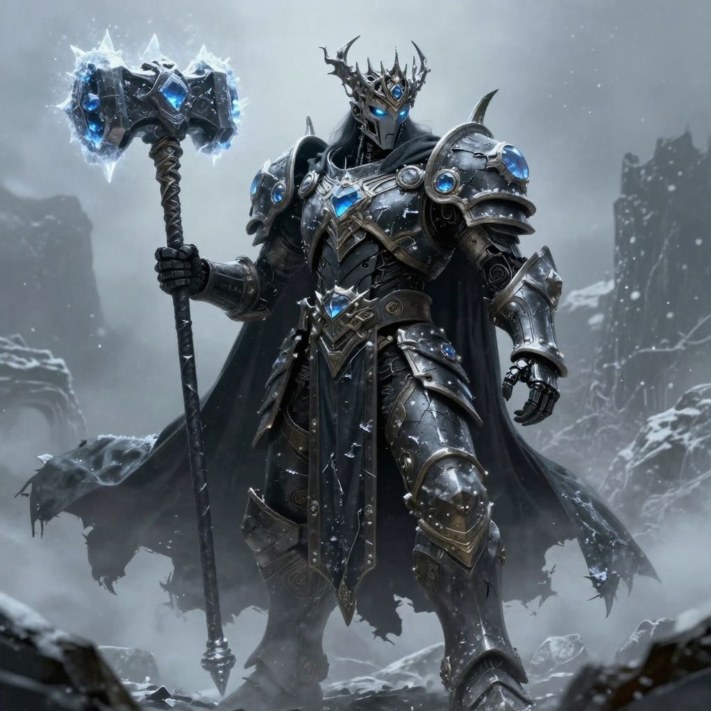 Digital artwork of a formidable, armored figure standing in a snowy, rocky landscape. The warrior is clad in dark, ornate, metallic armor with glowing blue accents and a flowing, tattered black cape. A crown with blue gemstones adorns his head, and he holds a massive, glowing blue and silver hammer in his right hand. His blue glowing eyes and the hammer's energy suggest a magical or otherworldly power. The background features misty, snow-covered rocks and a cloudy, overcast sky. The overall style is epic fantasy, with a focus on dark, gothic elements and high detail.