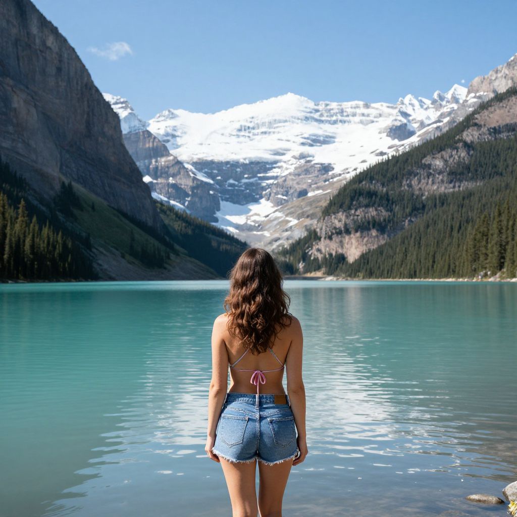 Back turned, a woman in denim shorts and a strappy bikini top gazes at the serene turquoise waters of Lake Louise, framed by majestic snow-capped peaks and dense evergreen forests under a clear blue sky.