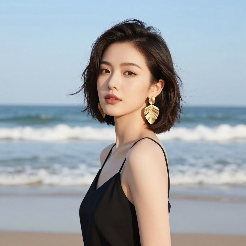 A digitally illustrated portrait of a woman standing on a beach with the ocean waves and clear sky in the background. She has short dark hair styled in soft waves, wears large gold leaf-shaped earrings and a black sleeveless top, capturing a serene and elegant moment by the seaside.