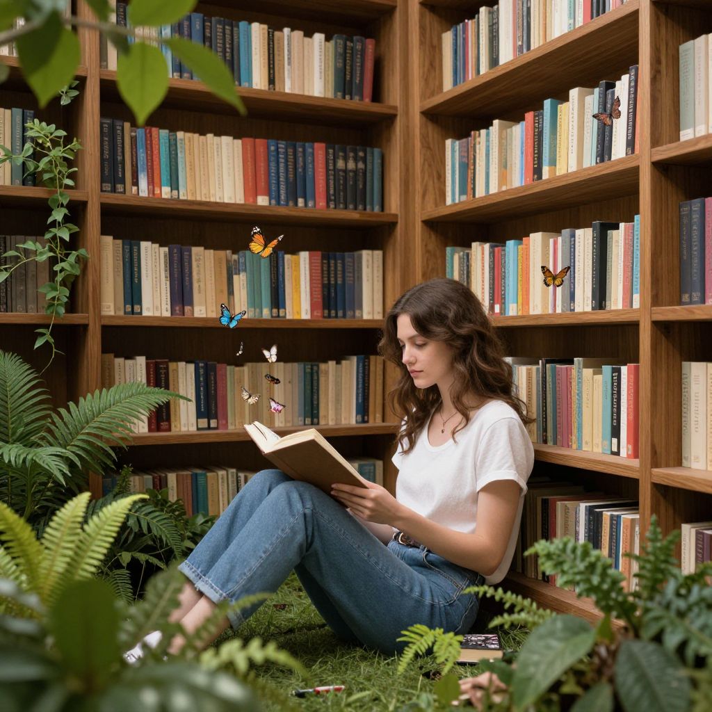 A serene library blends seamlessly with nature as a woman engrossed in reading sits surrounded by vibrant greenery, wooden shelves filled with colorful books, and a flurry of butterflies fluttering around her, creating a magical interplay between literature and life.