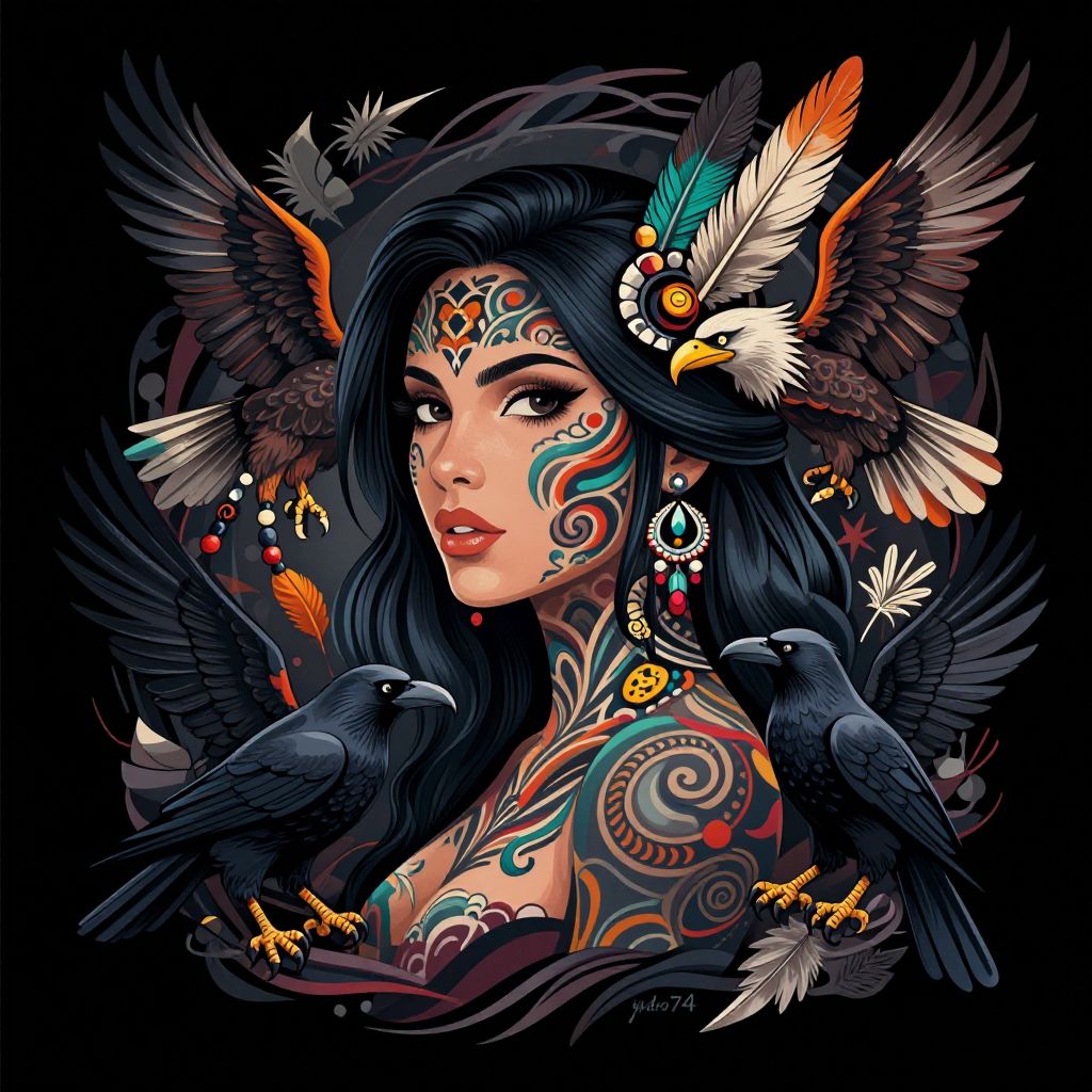 The image is a striking vector art piece featuring a woman with intricate tattoos covering her face and neck. Her hair is long and dark, adorned with feathers and other decorative elements. The tattoos are elaborate, with swirling patterns and symbols that add a sense of depth and complexity to her appearance. Surrounding her are various birds, including an eagle and a raven, which are depicted with detailed feathers and sharp talons. The background is a dark, almost black, which contrasts sharply with the vibrant colors of the tattoos and birds. The overall composition is dynamic, with the woman's face and tattoos serving as the focal point, while the birds and feathers create a sense of movement and energy. The use of light and shadow adds a three-dimensional quality to the image, making the tattoos and birds appear almost lifelike. The artist's signature, \"hydro74,\" is subtly integrated into the design, adding a personal touch to the piece.