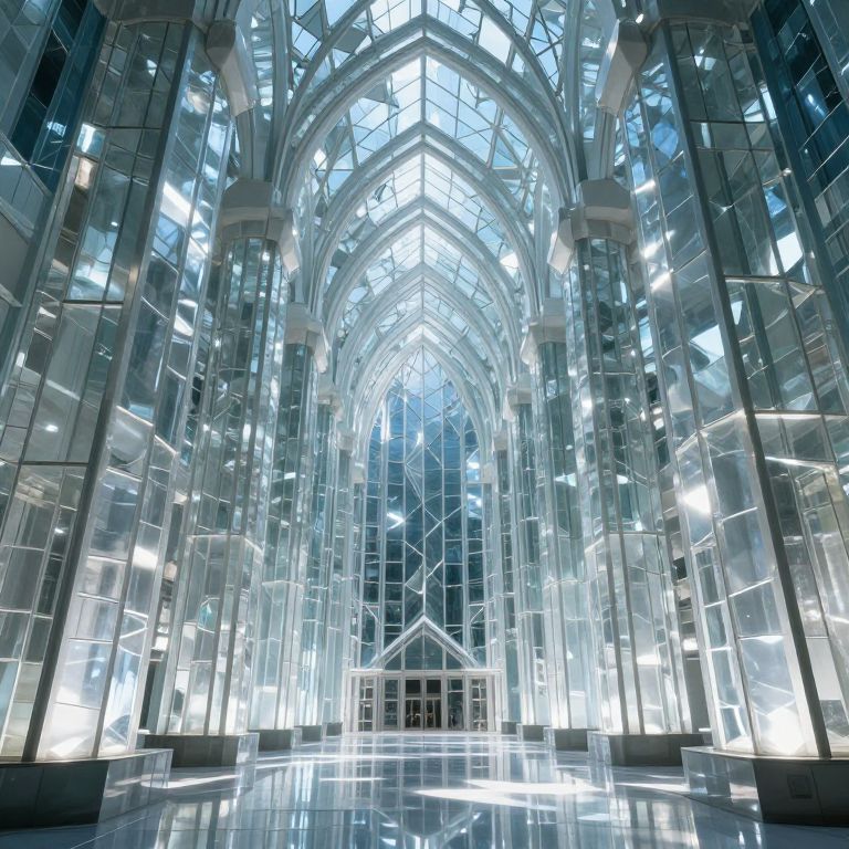A luminous cathedral of crystalline pillars and fractured glass arches bathes in ethereal light, its geometric forms shimmering like liquid mirrors while cascading reflections dance across the floor.