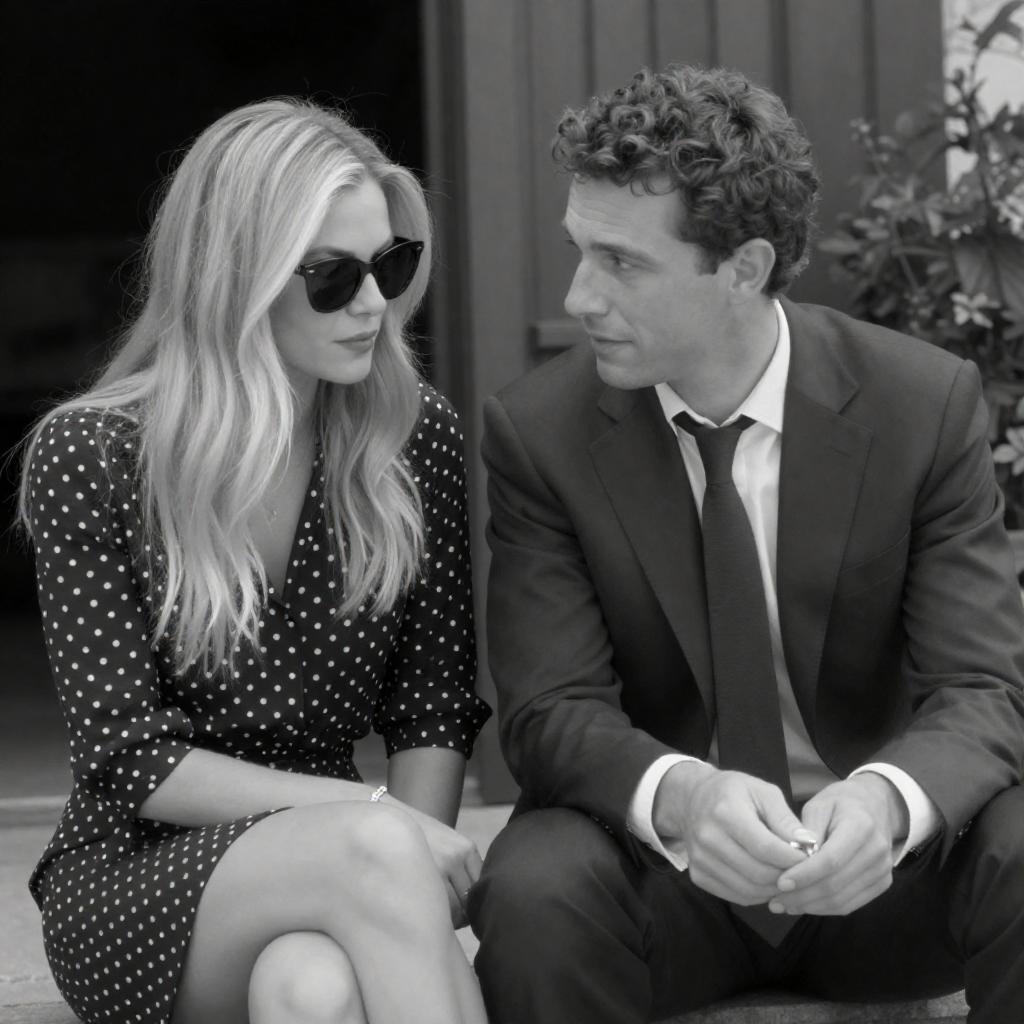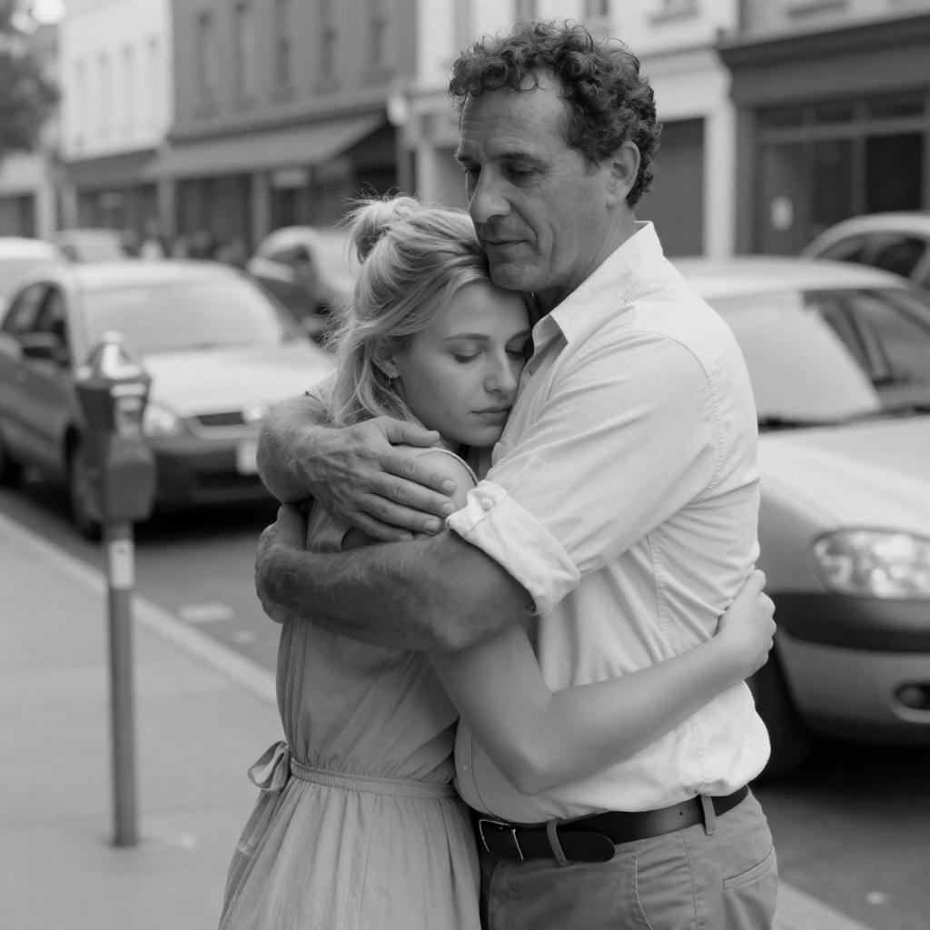 Black and white photograph of a middle-aged man and a young woman hugging tightly on a city street. The man has short, dark, curly hair and wears a light-colored shirt and pants. The woman has blonde hair in a bun, wears a light-colored dress, and leans her head on the man's chest. Background includes parked cars and a parking meter. The man's arms wrap around her back and waist. Both have neutral facial expressions. Street and buildings in the background. Two people, intense emotional moment, street setting.