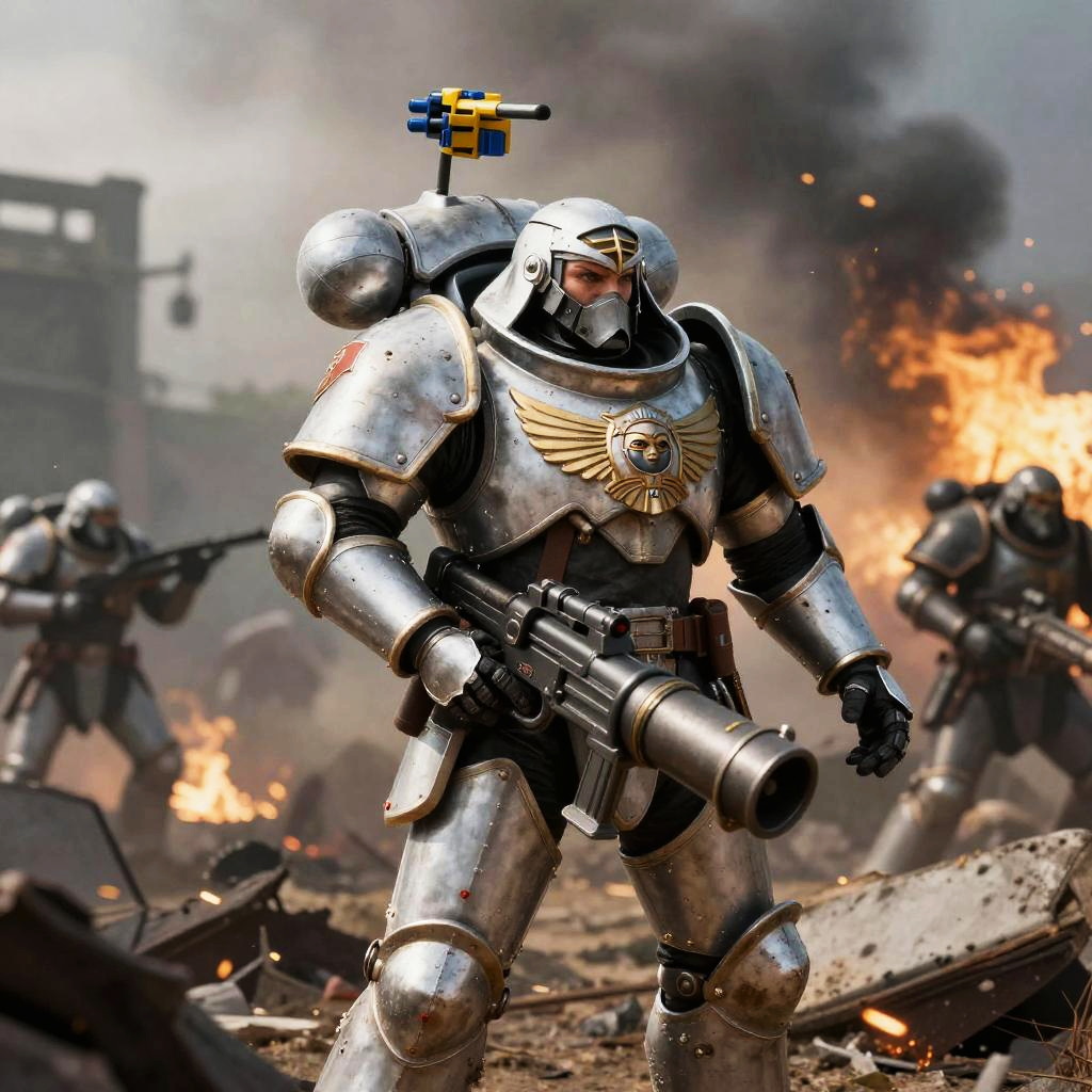 Realistic photo.Heroic image of a Sister of Battle (Adepta Sororitas), wearing battle-scarred plates, holding a rocket launcher, amidst the aftermath of a great battle. realistic photo