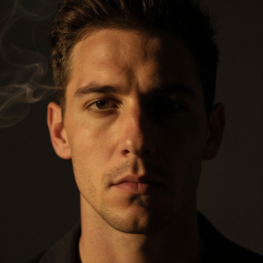 Close-up photograph of a serious, handsome man with short dark hair, half-lit face, and a faint wisp of smoke to the left.
