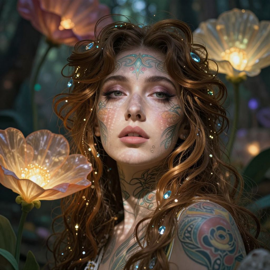 Imagine an Art Nouveau-inspired image showcasing a close-up portrait of a mysterious woman with intricate facial tattoos. Surrounded by a surreal forest of oversized, glowing flowers in every color of the spectrum, their light casts dancing shadows on her delicate features. Captured from a low angle, this perspective emphasizes her refined facial contours and cascading hair adorned with shimmering gems that reflect the ethereal illumination. The harmonious blend of natural elements and exotic beauty evokes an emotional journey between awe and otherworldly enchantment, blurring the boundaries between reality and fantasy in this mesmerizing portrayal of rare allure.