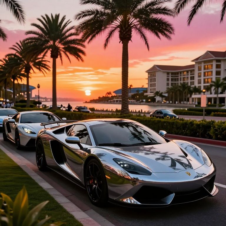 Rentals of luxury sports cars parked on a palm-lined boulevard, sunset backdrop with vibrant orange and pink hues, shiny chrome details sparkling, tropical environment with beautifully landscaped gardens and luxury hotels in the distance.