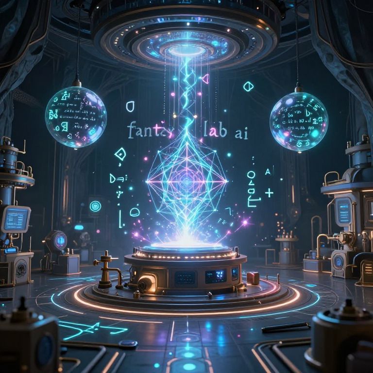 In a vast underground fantasy lab, an AI core pulses with arcane energy and geometric light patterns. Floating orbs contain glowing equations interwoven with spell symbols. The room is filled with enchanted machinery and glowing runes reacting to AI commands, blending science and sorcery in a harmonious fusion. The keyword 'fantasy lab ai' is etched in luminous runes across the wall.