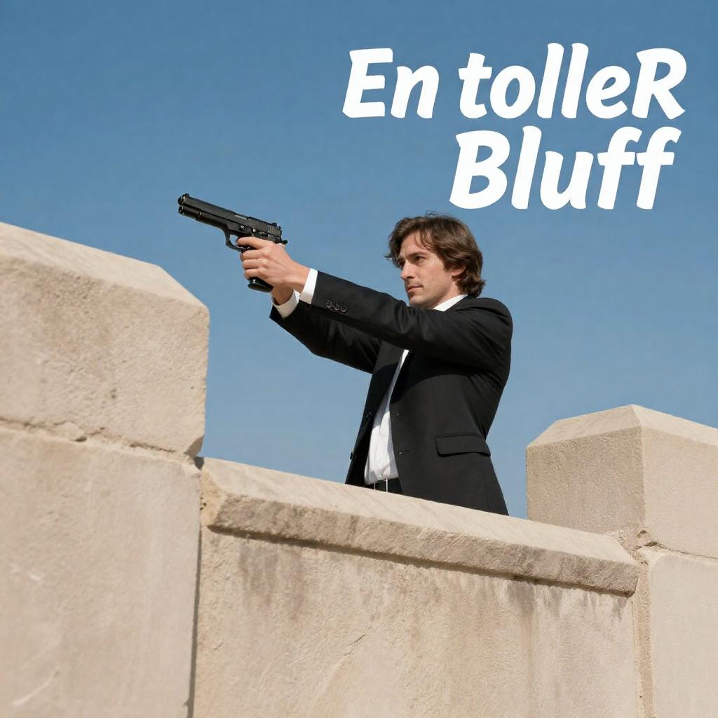 Photograph of a man with medium-length brown hair, wearing a black suit and white shirt, holding a black handgun above a stone wall. He is positioned between two large, beige stone blocks against a clear blue sky. The "En tolleR bluff" is in a white, bold, comic-style font in the upper right corner.