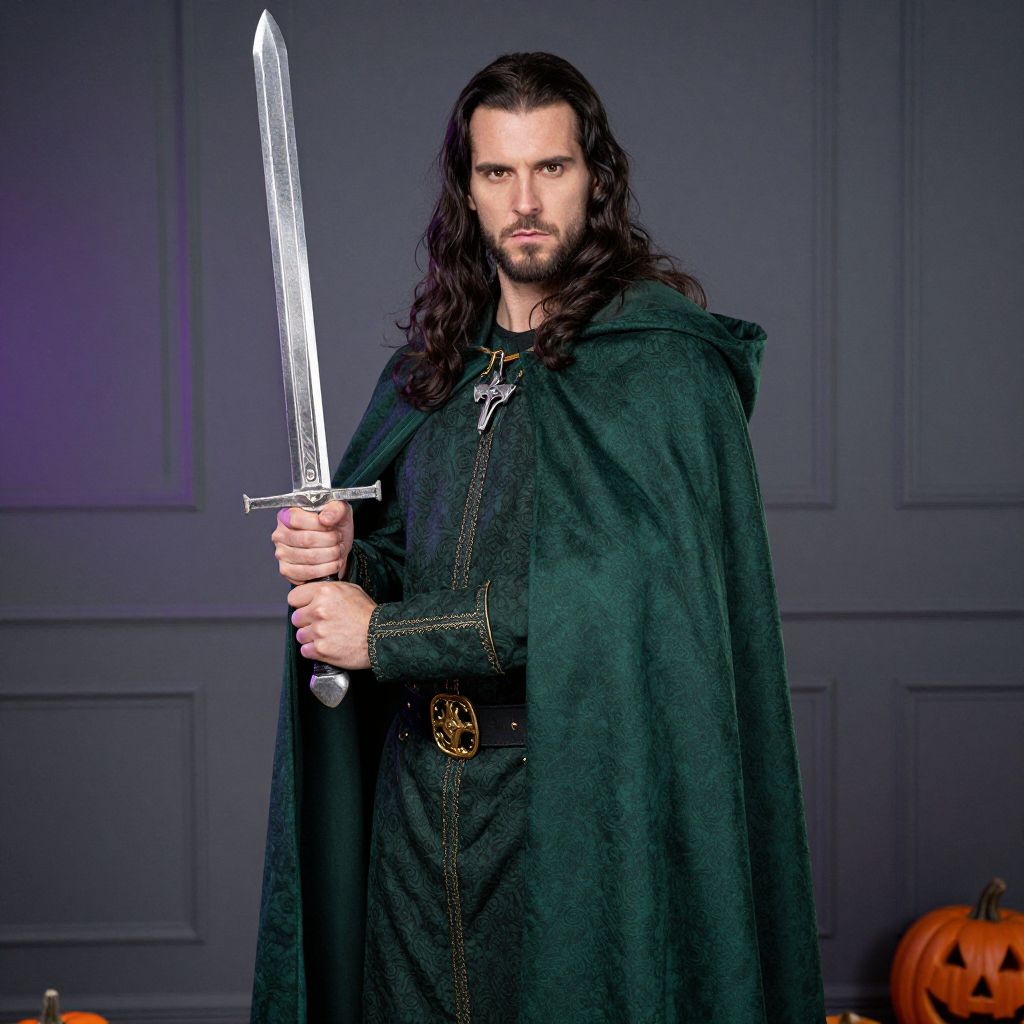 Lord rings halloween costume, man with long hair and a green cape holding a sword