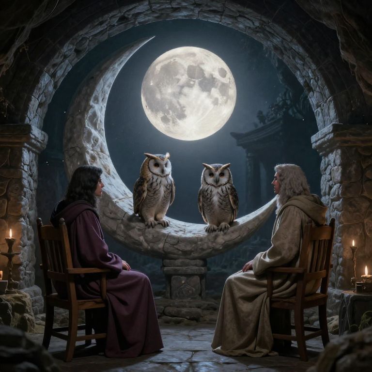 Owls perch solemnly in a crescent-shaped stone alcove beneath a full moon, flanked by two robed figures seated in wooden chairs, as they deliberate the enigmatic fate of forgotten dreams within a moonlit chamber that materializes only during nocturnal lunar phases.