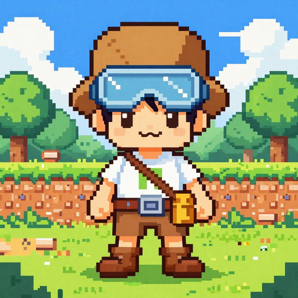 An extreme long shot showcasing a vibrant 8-bit landscape. The central figure is a young adventurer boy wearing goggles, embodying a treasure seeker. This pixelated masterpiece captures the essence of retro video games, influenced by the styles of Kazuo Oda and Masaaki Yuasa.