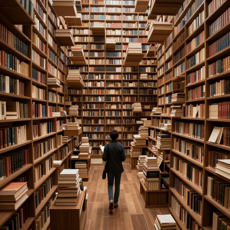 A labyrinthine library of floating books, where reading a sentence causes the reader to literally become the subject described.