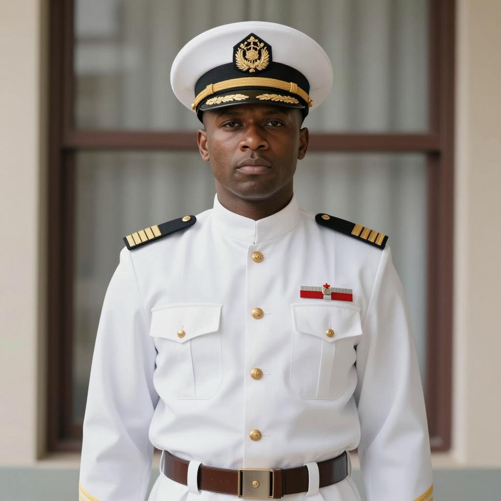 Ship captain outfit costume, photograph of a young, handsome male naval officer standing outdoors, daytime, clear sky, wearing white naval uniform with black shoulder stripes, white short-sleeved shirt, red and black necktie, name tag on left chest pocket, rank insignia on right chest, white naval hat with emblem, brown belt with gold buckle, black gloves, strong jawline, short dark hair, serious expression, background shows part of a building with balcony and railing, sunlit, realistic, military, professional, formal attire, medium shot