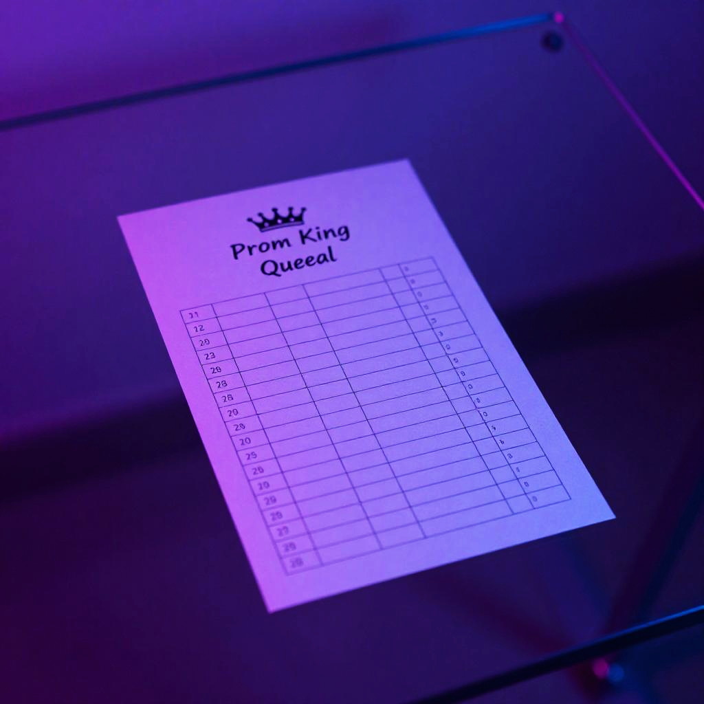 A single prom king and queen voting slip placed on a reflective glass surface, illuminated by neon purple and blue lighting, sharp focus on the handwritten votes, modern art style with minimalistic background