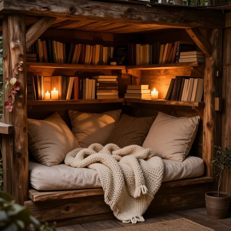 Photograph of a cozy wooden reading nook with a rustic, warm ambiance. The nook features a cushioned bench with three beige pillows and a chunky, cream-colored knitted blanket draped over the center. The wooden shelves behind the bench are filled with an array of books, illuminated by soft, glowing candles placed between the shelves. The wood has a weathered texture, adding to the rustic charm. In the bottom right corner, a small potted plant adds greenery. The background includes blurred outdoor foliage, enhancing the outdoor setting. The overall scene exudes warmth, comfort, and a love for reading.