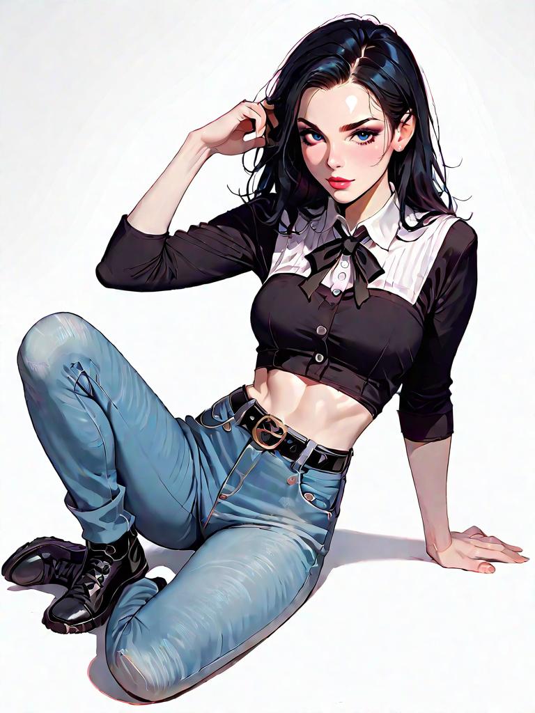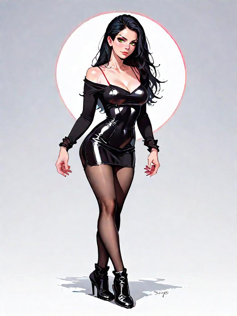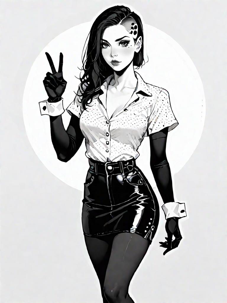 1girl, source_comics, realistic face, full body shot, Woman, chic, polka dot print blouse in black and white, V-neck with button details, elbow-length sleeves with elastic cuffs, paired with a glossy black faux leather skirt, asymmetrical cut with diagonal zipper feature, mini-length.